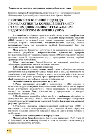 Королюк К. В. (2025) Нейропсихологічний підхід до профілактики та корекції дисграфії у старших дошкільників із загальним недорозвитком мовлення (ЗНМ). In: X Міжнародна студентська наукова конференція «Теоретичне та практичне застосування результатів сучасної науки», 12 грудня 2025 р., Запоріжжя. С. 610–611. DOI: 10.62732/liga-inter-12.12.2025.