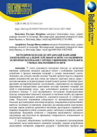 У статті розглянуто методичні підходи до організації навчання здобувачів загальної середньої освіти з особливими освітніми потребами у процесі вивчення географії в умовах інклюзивної освіти. Зазначено, що сучасна освітня система України орієнтується на створення рівних можливостей для всіх учнів, що вимагає адаптації змісту, форм і методів навчання до індивідуальних потреб кожної дитини. Особливу увагу приділено експериментальному дослідженню, спрямованому на перевірку ефективності використання адаптованих методик навчання географії для дітей із порушеннями слуху, зору, когнітивного розвитку та розладами аутичного спектра. У ході експерименту застосовано індивідуалізовані підходи, інтерактивні технології, візуальні та тактильні засоби, що сприяли підвищенню пізнавальної активності, соціальної взаємодії та успішності учнів. Результати порівняння контрольної та експериментальної груп показали зростання рівня засвоєння матеріалу, покращення комунікативних навичок і мотивації до навчання. Доведено, що впровадження адаптованих методик сприяє розвитку критичного мислення, просторового сприйняття, підвищує впевненість учнів у власних силах і забезпечує комфортне освітнє середовище. Важливим аспектом є створення інклюзивного освітнього середовища, яке базується на принципах толерантності, взаємоповаги та педагогічної підтримки.