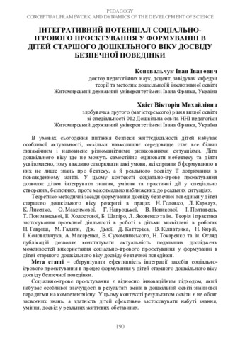 Інтегративний потенціал соціально-ігрового проєктування у формуванні в дітей старшого дошкільного віку досвіду безпечної поведінки.