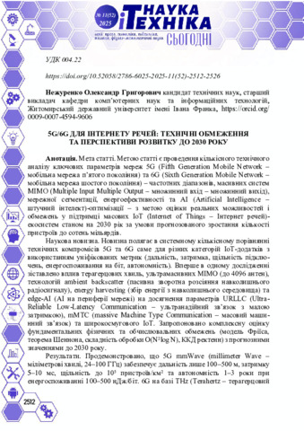 Метою статті є проведення кількісного технічного аналізу ключових параметрів мереж 5G (Fifth Generation Mobile Network – мобільна мережа п’ятого покоління) та 6G (Sixth Generation Mobile Network – мобільна мережа шостого покоління) – частотних діапазонів, масивних систем MIMO (Multiple Input Multiple Output – множинний вхід – множинний вихід), мережної сегментації, енергоефективності та AI (Artificial Intelligence – штучний інтелект)-оптимізації – з метою оцінки реальних можливостей і обмежень у підтримці масових IoT (Internet of Things – Інтернет речей) - екосистем станом на 2030 рік за умови прогнозованого зростання кількості пристроїв до сотень мільярдів.