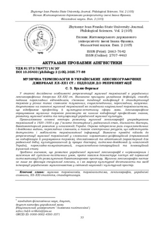 Музична термінологія в українських лексикографічних джерелах XX–XXI ст.: підходи до репрезентації.