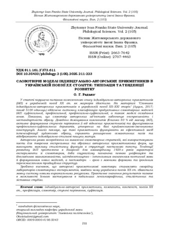 Радько О. Г.ORCID: https://orcid.org/0009-0000-4198-5043 (2025) Словотвірні моделі індивідуально-авторських прикметників в українській поезії XX століття: типізація та тенденції розвитку. Вісник Житомирського державного університету імені Івана Франка. Філологічні науки. № 105. С. 211–223. ISSN 2663-7642. DOI: 10.35433/philology.2(105).2025.211-223.