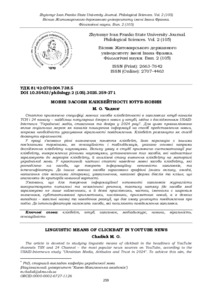 Чадюк М. О.ORCID: https://orcid.org/0000-0002-6727-1126 (2025) Мовні засоби клікбейтності ютуб-новин. Вісник Житомирського державного університету імені Івана Франка. Філологічні науки. № 105. С. 259–271. ISSN 2663-7642. DOI: 10.35433/philology.2(105).2025.259-271.