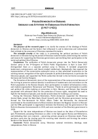 | ДСТУ 8302:2015: | Білобровець О. М. Польські демократи в Україні: ідеологія та ставлення до українського державотворення (1917-1921). Емінак. 2025. № 51. С. 160–174. DOI: 10.33782/eminak2025.3(51).814. |