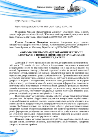 Формування інформаційної компетентності здобувачів у процесі вивчення історії засобами історичних джерел.