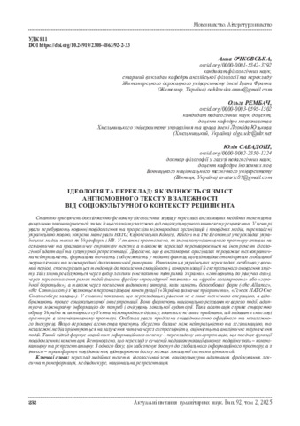 Статтю присвячено дослідженню феномену ідеологічних зсувів у перекладі англомовних медійних текстів та виявленню закономірностей зміни їхнього змісту залежно від соціокультурного контексту реципієнта. У центрі уваги перебувають новинні повідомлення та пресрелізи міжнародних організацій і провідних медіа, перекладені українською мовою, зокрема матеріали НАТО, Європейської Комісії, Reuters та The Economist у перекладах українських медіа, таких як Укрінформ і НВ. У статті простежено, як зміна комунікативного простору впливає на семантичну та прагматичну структуру тексту, а також як переклад перетворюється на інструмент ідеологічної адаптації та культурної репрезентації. Доведено, що в англомовних оригіналах переважає технократична нейтральність, формальна точність і обережність у поданні фактів, що відповідає стандартам глобальної журналістики та міжнародної дипломатичної риторики. Натомість в українських перекладах, особливо у воєнний період, спостерігається тенденція до посилення емоційності, конкретизації й експресивного оновлення змісту. Такі зміни реалізуються через вибір лексики («непохитна підтримка України», «готовність до рішучих дій»), через переосмислення рамок подій (заміна фрейму «процедурної політики» на «фрейм солідарності» або «героїчної боротьби»), а також через посилення видимості акторів, коли замість безособових форм («the Alliance», «the Commission») з’являються персоналізовані конструкції («Україна визначає пріоритети», «Генсек НАТО Єнс Столтенберг заявив»). У статті показано, що перекладацькі рішення не є лише технічною операцією, а відображають процес соціокультурної інтерпретації. Вони формують національно релевантну версію події, адаптуючи міжнародну інформацію до потреб і очікувань локальної аудиторії. Така адаптація сприяє створенню образу України як активного суб’єкта міжнародного діалогу, здатного не лише приймати, а й задавати смислові орієнтири в комунікативному просторі. Особлива увага приділена співвідношенню офіційного та незалежного дискурсів. Якщо державні агентства прагнуть зберегти баланс між нейтральністю та легітимацією, то незалежні медіа орієнтуються на залучення читача через експресивність, оцінність та аналітичне тлумачення подій. Такий підхід формує новий тип інформаційного тексту – перекладену інтерпретацію, що поєднує функції повідомлення і коментаря. Встановлено, що переклад у сучасній медіакомунікації виконує подвійну роль – комунікативну та репрезентативну. З одного боку, він забезпечує доступ до глобального інформаційного простору, а з іншого – трансформує повідомлення, відтворюючи його у межах локальної системи цінностей.