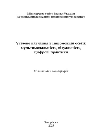 Школа І. В.ORCID: https://orcid.org/0000-0002-1455-6371, Салюк Б. А.ORCID: https://orcid.org/0000-0002-9952-2399, Прокопчук Н. Р.ORCID: https://orcid.org/0000-0001-6609-8109, Дмітренко Н. Є.ORCID: https://orcid.org/0000-0002-3556-0003, Панченко В. В.ORCID: https://orcid.org/0000-0002-2958-5802, Дуброва О. В.ORCID: https://orcid.org/0000-0001-8573-2785, Побережний Д. О.ORCID: https://orcid.org/0000-0002-4789-9848 (2025) Утілене навчання в іншомовній освіті: мультимодальність, візуальність, цифрові практики. ПП «Євро-Волинь», Запоріжжя. ISBN 978-617-7992-88-1.