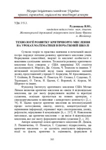 Рудницька Н. Ю.ORCID: https://orcid.org/0000-0002-2377-9251 (2025) Технології розвитку критичного мислення на уроках математики в початковій школі. In: ХІІІ Всеукраїнська науково-практична конференція «Наукові ініціативи сьогодення України: правові, економічні, соціальні та поведінкові аспекти», 10–11 грудня 2025 р., Житомир. С. 385–389.