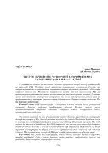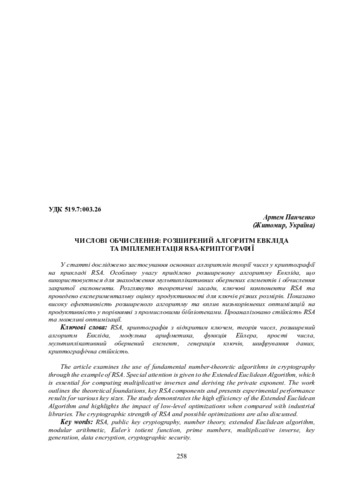 Панченко А. С. (2025) Числові обчислення: розширений алгоритм Евкліда та імплементація RSA-криптографії. In: Міжнародна науково-практична Інтернет-конференція «Тенденції та перспективи розвитку науки і освіти в умовах глобалізації», 28 листопада 2025 р., Переяслав. С. 258–261.