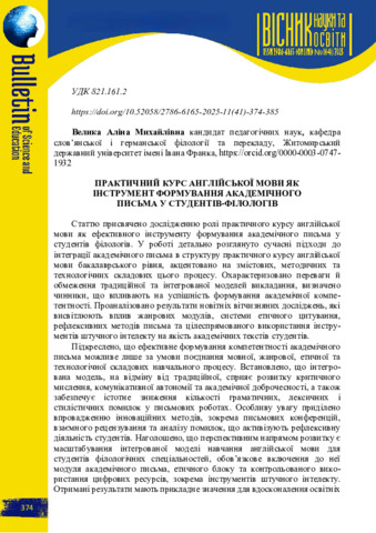 | ДСТУ 8302:2015: | Велика А. М. Практичний курс англійської мови як інструмент формування академічного письма у студентів-філологів. Вісник науки та освіти. 2025. № 41. С. 374–385. DOI: 10.52058/2786-6165-2025-11(41)-374-385. |