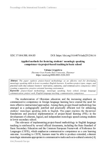 Applied methods for fostering students’ monologic speaking competence via project-based teaching in basic school.