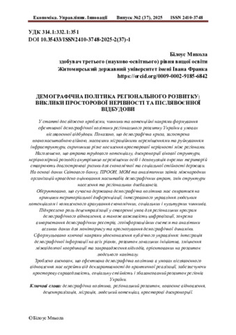 У статті досліджено проблеми, чинники та потенційні напрями формування ефективної демографічної політики регіонального розвитку України в умовах післявоєнної відбудови. Показано, що демографічна криза, загострена повномасштабною війною, масовими міграційними переміщеннями та руйнуванням інфраструктури, спричинила різке посилення просторової нерівності між регіонами. Наголошено, що втрата трудового потенціалу, диспропорції вікової структури, нерівномірний розподіл внутрішньо переміщених осіб і депопуляція окремих територій створюють довгострокові ризики для економічної та соціальної стійкості держави. На основі даних Світового банку, ПРООН, МОМ та аналітичних звітів міжнародних організацій проведено оцінювання масштабів демографічних втрат, змін структури населення та регіональних дисбалансів.
