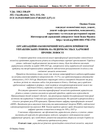 У статті проведено комплексний аналіз трансформації організаційно-економічного механізму прийняття управлінських рішень на підприємствах харчової промисловості України в умовах глобальної турбулентності та воєнного стану. Було досліджено еволюцію управлінських підходів за період 2000-2025 рр., виокремлено зміну парадигми від максимізації прибутку та теорії трансакційних витрат до забезпечення резильєнтності (resilience) та стійкості ланцюгів постачання..