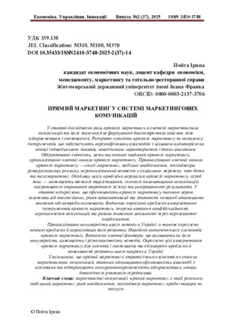 У статті досліджено роль прямого маркетингу в системі маркетингових комунікацій та його значення для формування довгострокових взаємин між підприємством і споживачем. Розкрито сутність прямого маркетингу як комплексу інструментів, що забезпечують персоніфіковану взаємодію з цільовою аудиторією на основі індивідуальних запитів, поведінкових характеристик і даних аналітики. Обґрунтовано сутність, мету та основні завдання прямого маркетингу, проаналізовано ключові канали прямого маркетингу. Проаналізовано ключові канали прямого маркетингу — email-маркетинг, мобільні повідомлення, месенджери, ретаргетингову рекламу, персоналізований контент у соціальних мережах, чат-боти та телемаркетинг. Особливу увагу приділено перевагам прямого маркетингу, серед яких — можливість точного таргетування, гнучкого налаштування комунікацій, оперативного отримання зворотного зв’язку та вимірюваності результатів. У статті підкреслено, що ефективність прямого маркетингу значною мірою залежить від якості даних, рівня автоматизації та здатності компанії адаптувати контент під потреби споживача. Водночас окреслено проблеми використання інструментів прямого маркетингу, зокрема питання конфіденційності, перенасичення комунікацій та ризики зниження лояльності через нерелевантні повідомлення.