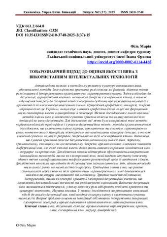 Філь М. І.ORCID: https://orcid.org/0000-0002-6114-4468 (2025) Товарознавчий підхід до оцінки якості вина з використанням інтелектуальних технологій. Економіка. Управління. Інновації. № 37. С. 247–264. ISSN 2410-3748. DOI: 10.35433/ISSN2410-3748-2025-2(37)-15.