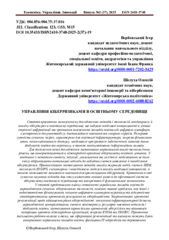 Стаття присвячена комплексному дослідженню методів і технологій моніторингу й аналізу кіберзагроз в освітньому середовищі, що набуває особливої актуальності в умовах стрімкої цифровізації та зростання залежності закладів освіти від цифрових платформ, електронного документообігу, дистанційного навчання та хмарних сервісів. Розкрито сутність сучасних загроз, характерних для освітньої інфраструктури, зокрема фішингових атак, несанкціонованого доступу, шкідливого програмного забезпечення, витоків даних здобувачів освіти та персоналу, а також маніпулятивних інформаційних впливів.