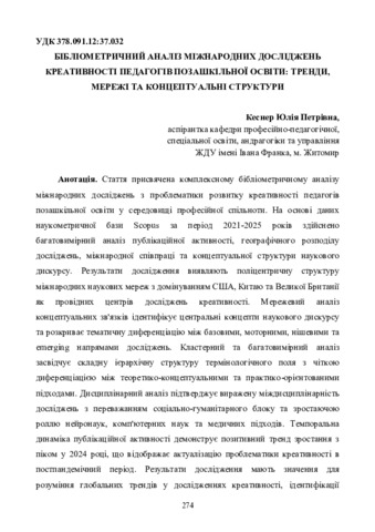 Кеснер Ю. П.ORCID: https://orcid.org/0009-0003-3624-7654 (2025) Бібліометричний аналіз міжнародних досліджень креативності педагогів позашкільної освіти: тренди, мережі та концептуальні структури. In: IV Міжнародна науково-практична конференція «Innovations of modern science and education», 25–27 грудня 2025 р., Ванкувер, Канада. С. 274–286.