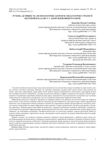 У статті досліджено взаємозв’язок між руховою активністю та психологічним здоров’ям здобувачів вищої освіти в умовах сучасного освітнього простору. Показано, що навчальне середовище закладів вищої освіти висуває низку викликів для молоді, серед яких переважають малорухливий спосіб життя, тривале перебування за комп’ютером, нерегулярний режим дня, поєднання навчання з підробітком, соціально-психологічна адаптація, цифрова залежність та надмірні емоційні навантаження. Такі фактори зумовлюють підвищення рівня стресу, тривожності та психоемоційного виснаження, що негативно позначається як на академічних результатах, так і на загальному самопочутті здобувачів вищої освіти.Обґрунтовано педагогічні стратегії, спрямовані на підтримку балансу між фізичним та психічним здоров’ям здобувачів вищої освіти. Серед ключових напрямів визначено інтеграцію рухової активності у навчальний процес шляхом упровадження динамічних пауз, використання методів активного навчання та універсального дизайну програм фізичного виховання; розвиток навичок саморегуляції та здоров’язбереження через тренінги зі стрес-менеджменту, навчання релаксаційним і дихальним практикам, індивідуалізацію планів фізичної активності; створення інклюзивного освітнього середовища із забезпеченням доступності спортивної інфраструктури, функціонуванням психологічних служб, впровадженням групових форм рухової діяльності, що підсилюють соціалізацію; поєднання валеологічних та екологічних практик, зокрема організацію занять на свіжому повітрі, прогулянок і туристичних походів, застосування «зелених практик» як ресурсу відновлення енергії та профілактики тривожності. Зроблено висновок, що системне поєднання зазначених стратегій сприяє формуванню у здобувачів вищої освіти здоров’язбережувальної компетентності, підвищенню стресостійкості, формуванню позитивної мотивації до фізичної активності та гармонійному розвитку особистості. Отримані результати мають практичне значення для оптимізації освітнього процесу, розробки університетських програм підтримки благополуччя здобувачів вищої освіти та формування інклюзивного академічного простору.