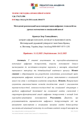 У статті акцентовано на корекційно-адаптивному потенціалі цифрових інструментів, зокрема можливості їхнього застосування до когнітивно-сенсорних порушень у школярів, візуалізації навчального матеріалу та індивідуалізації освітнього процесу. Метою статті є обґрунтування та розроблення методичних рекомендацій щодо використання цифрових технологій на уроках математики в спеціальній школі для учнів з особливими освітніми потребами. Методи. Використано сукупність взаємопов’язаних методів дослідження: аналіз і узагальнення науково-педагогічної, психолого-педагогічної та спеціальної літератури з проблем цифровізації інклюзивної та спеціальної освіти; системний і структурно-функціональний аналіз цифрових інструментів з позицій їхніх корекційно-адаптивних можливостей.Результати. Доведено, що результативність впровадження цифрового інструментарію під час викладання математики в спеціальних закладах освіти безпосередньо залежить від адаптації контенту до особливих освітніх потреб школярів та фокусування на корекційних цілях. Апробація адаптованих цифрових інструментів довела їхню здатність компенсувати порушені функції, знижувати когнітивне навантаження, забезпечувати доступність математичного змісту та підвищувати навчальну автономію учнів з різними освітніми труднощами. Виявлено трансформацію ролі вчителя на тьютора й фасилітатора та зростання навчальної активності, мотивації й залученості учнів у процесі взаємодії з адаптивним цифровим середовищем. Висновки. Обґрунтовано, що застосування цифрових технологій на уроках математики в спеціальній школі повинно спиратися на їхню корекційно-адаптивну функцію та враховувати індивідуальні освітні потреби учнів з особливими освітніми потребами. Узагальнено методичні засади адаптації цифрових ресурсів, що забезпечують доступність математичного матеріалу, стимулюють розвиток пізнавальних процесів та сприяють переходу до активної навчальної діяльності. Визначено доцільність інтеграції цифрових засобів за умови посилення корекційного аспекту освітнього процесу та необхідність залучення інтерактивних ресурсів з огляду на підвищення ефективності діяльності вчителя.