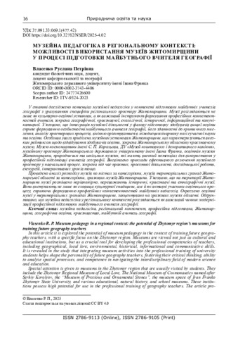 Власенко Р. П.ORCID: https://orcid.org/0000-0002-3743-4406 (2025) Музейна педагогіка в регіональному контексті: можливості використання музеїв Житомирщини у процесі підготовки майбутнього вчителя географії. Природнича освіта та наука. № 4. С. 16–25. ISSN 2786-9105. DOI: 10.32782/NSER/2025-4.02.
