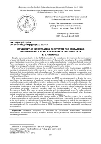 Чайковська Г. Б.ORCID: https://orcid.org/0000-0003-4614-3843 (2025) Університет як екосистема освіти для сталого розвитку: структурно-функціональний підхід. Вісник Житомирського державного університету імені Івана Франка. Педагогічні науки. № 122. С. 20–35. ISSN 2663-6387. DOI: 10.35433/pedagogy.3(122).2025.2.