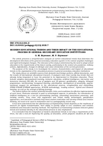 | ДСТУ 8302:2015: | Кривонос О. М., Кривонос М. П. Сучасні освітні тренди та їх вплив на освітній процес в закладах загальної середньої освіти. Вісник Житомирського державного університету імені Івана Франка. Педагогічні науки. 2025. № 122. С. 97–113. DOI: 10.35433/pedagogy.3(122).2025.7. |