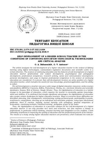 Self-Development of a Higher School Teacher in the Conditions of Continuing Education Using Digital Technologies and Critical Analysis.