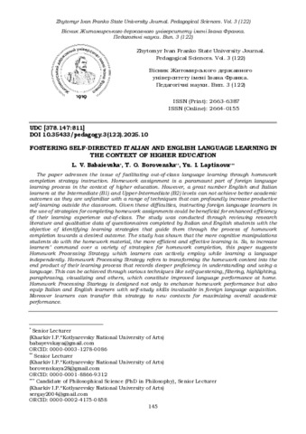 ДСТУ 8302:2015: Бабаєвська Л. В., Боровенська Т. О., Лаптінова Ю. І. Fostering Self-Directed Italian and English Language Learning in the Context of Higher Education. Вісник Житомирського державного університету імені Івана Франка. Педагогічні науки. 2025. № 122. С. 145–152. DOI: 10.35433/pedagogy.3(122).2025.10.