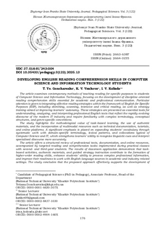 ДСТУ 8302:2015: Гончаренко Т. Є., Внукова К. В., Коляда І. В. Формування навичок читання та розуміння англійських текстів у студентів комп’ютерних наук та інформаційних технологій. Вісник Житомирського державного університету імені Івана Франка. Педагогічні науки. 2025. № 122. С. 176–193. DOI: 10.35433/pedagogy.3(122).2025.13.