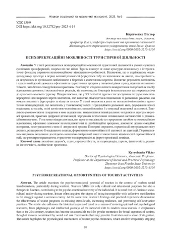 У статті розглядаються психорекреаційні можливості туристичної діяльності в умовах сучасних суспільних трансформацій, зокрема під час війни. Туризм виконує не лише культурно-пізнавальну, а й терапевтичну функцію, сприяючи психоемоційному відновленню особистості. Відзначено, що в українському соціокультурному просторі в період воєнної реальності формується табу на відпочинок як явище, що сприймається несумісним із суспільною мобілізацією в боротьбі з колективним ворогом. Водночас результати досліджень і практичний досвід доводять ефективність туристичних програм у зниженні рівня стресу, підвищенні життєстійкості, запобіганні саморуйнівним практикам. Розглянуто історичні аспекти використання подорожей як засобу відновлення духовних і психологічних ресурсів, від паломництва й мандрів інтелектуальних еліт середньовіччя до сучасного масового туризму. Підкреслюється, що у ХХІ столітті туризм стає доступним інструментом психорекреації для широких верств населення, але водночас обмежується соціальними й рольовими рамками, які можуть викликати фрустрацію та відчуття застою. У статті звертається увага на психологічні механізми туристичної психорекреації, що полягають у тимчасовому виході з традиційного рольового кола, формуванні нових соціальних контактів, зміні когнітивно-поведінкових моделей психіки й стимуляції пошукової активності. Важливою умовою є повне занурення в нове середовище, використання індивідуальних чи групових програм короткої тривалості, практики цифрової детоксикації, чергування інтенсивних пізнавальних активностей із релаксаційними паузами. У висновку підкреслюється, що туристична діяльність є природним засобом психоемоційного відновлення, ефективно доповнює психотерапевтичні та реабілітаційні програми, допомагає долати емоційне вигорання, посттравматичні стани й депресивні прояви. Подорожі сприяють гармонізації внутрішнього світу людини, розширенню її соціального досвіду, формуванню життєстійкості й здатності до адаптації. Перспективним напрямом подальших досліджень визначено емпіричний аналіз типологічних відмінностей стресостійкості осіб, що регулярно практикують туристичну психорекреацію як форму організації дозвілля.