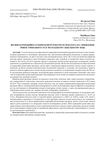 У статті аналізується ефективність корекційно-розвиткової програми психолога щодо зниження рівня тривожності в молодшому шкільному віці. Дослідження побудовано відповідно до правил формувального експерименту, до якого залучено одну експериментальну групу. На І етапі дослідження емпіричні дані про рівень тривожності дітей молодшого шкільного віку отримано за допомогою шкали дитячої тривожності Ла Спенса SCAS-8 (коротка версія) й авторської діагностичної процедури дослідження дитячої тривожності, розробленої на основі методу незакінчених речень. На ІІ етапі дослідження діти були включені до корекційно-розвиткової програми, метою якої є покращення вміння визначати власні сильні сторони та труднощі, розвиток навичок комунікативної оптимальної взаємодії в ситуаціях, які викликають тривогу, розвиток уміння вербалізувати власні емоції, розвиток емоційної та поведінкової саморегуляції. На ІІІ етапі дослідження відбулося повторне дослідження рівня тривожності дітей молодшого шкільного віку після участі в корекційно-розвитковій програмі. Для перевірки статистичної достовірності результатів дослідження використано критерій знаків G.Використання критерію знаків G не показало статистично значущих змін у рівні загальної, генералізованої, сепараційної й соматичних симптомів тривожності/паніки за шкалою дитячої тривожності Ла Спенса SCAS-8. Таку тенденцію, імовірно, можна пояснити тим, що період упровадження корекційно-розвиткової програми збігся з підвищенням рівня захворюваності дітей на респіраторно-вірусні інфекції та порушеннями сну, пов’язаними зі збільшенням кількості повітряних нічних тривог, а також опосередкованим прослуховуванням новин дітьми, що, зокрема, посилює сепараційну тривожність.Аналіз результатів дослідження тривожності після корекційно-розвиткової програми за авторською анкетою незавершених речень показав зменшення відсотка дітей із високим рівнем тривожності (з 19,4% до 8,3%), збільшення відсотка дітей із середній рівнем тривожності (з 80,6% до 88,9%), появу 2,8% дітей із низьким рівнем тривожності. Спираючись на дані критерію знаків G, можна констатувати, що відмінності між результатами до й після впровадження корекційно-розвиткової програми мають статистично значущі зміни в рівні тривожності за авторською анкетою незавершених речень. Тобто корекційно-розвиткова програма виявила свою ефективність щодо усвідомлення власних сильних сторін і труднощів, розвитку емоційної та поведінкової саморегуляції та вироблення ефективних стратегій взаємодії з навколишніми в ситуаціях, які викликають тривожність.