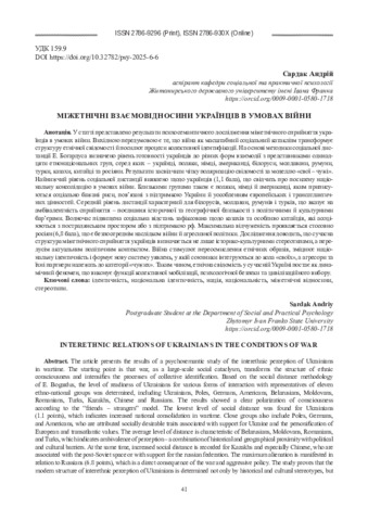 | ДСТУ 8302:2015: | Сардак А. Ю. Міжетнічні взаємовідносини українців в умовах війни. Журнал соціальної та практичної психології. 2025. № 6. С. 41–46. DOI: 10.32782/psy-2025-6-6. |