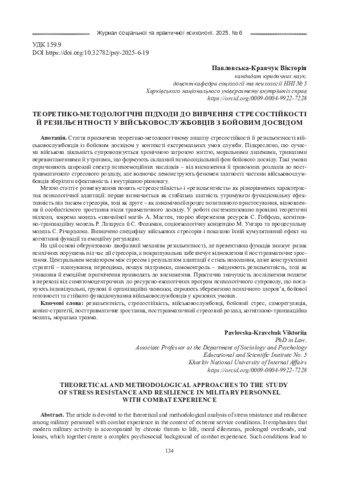 Стаття присвячена теоретико-методологічному аналізу стресостійкості й резильєнтності військовослужбовців із бойовим досвідом у контексті екстремальних умов служби. Підкреслено, що сучасна військова діяльність супроводжується хронічною загрозою життю, моральними дилемами, тривалими перевантаженнями й утратами, що формують складний психосоціальний фон бойового досвіду. Такі умови спричиняють широкий спектр психоемоційних наслідків – від виснаження й тривожних розладів до посттравматичного стресового розладу, але водночас демонструють феномен здатності частини військовослужбовців зберігати ефективність і внутрішню рівновагу. Метою статті є розмежування понять «стресостійкість» і «резильєнтність» як різнорівневих характеристик психологічної адаптації: перше визначається як стабільна здатність утримувати функціональну ефективність під тиском стресорів, тоді як друге – як динамічний процес позитивного пристосування, відновлення й особистісного зростання після травматичного досвіду. У роботі систематизовано провідні теоретичні підходи, зокрема модель «звичайної магії» А. Мастен, теорію збереження ресурсів С. Гобфола, когнітивно-транзакційну модель Р. Лазаруса й С. Фолкман, соціоекологічну концепцію М. Унгара та процесуальну модель С. Річардсона. Визначено специфіку військових стресорів і показано їхній кумулятивний ефект на когнітивні функції та емоційну регуляцію.На цій основі обґрунтовано двофазний механізм резильєнтності, де превентивна функція знижує ризик психічних порушень під час дії стресорів, а покращувальна забезпечує відновлення й посттравматичне зростання. Центральним медіатором між стресом і результатом адаптації є стиль подолання, адже конструктивні стратегії – планування, переоцінка, пошук підтримки, самоконтроль – зміцнюють резильєнтність, тоді як уникання й емоційне пригнічення призводять до виснаження. Практична значущість дослідження полягає в переході від симптомоцентричних до ресурсно-екологічних програм психологічного супроводу, що поєднують індивідуальні, групові й організаційні чинники, сприяють збереженню психічного здоров’я, бойової готовності та стійкого функціонування військовослужбовців у кризових умовах.