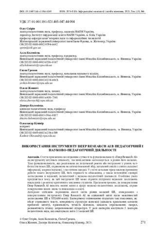 Стаття присвячена дослідженню сутності та функціональності «Deep Research AI» як інструменту штучного інтелекту, що нині активно застосовується в різних його моделях. Така функціональність, яка реалізована як додатковий режим або інструмент у різних чат-ботах/системах ШІ, спрямована на автоматизований збір, детальний аналіз і синтез складної інформації, зокрема наукової, з доступних джерел. У статті детально представлено принципи роботи такого інструменту ШІ, його переваги та обмеження, а також потенційні сценарії застосування в науковій, педагогічній і науково-педагогічній діяльності. Особлива увага приділяється тому, як цей інструмент ШІ може сприяти підтримці наукових досліджень викладачів і розвитку критичного мислення студентів. Продемонстровано, як використання Deep Research AI вносить значні зміни в сферу науково-педагогічних досліджень, сприяє генеруванню нових знань та інноваціям в освіті.