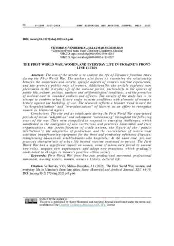| ДСТУ 8302:2015: | Венгерська В. О., Магась-Демидас Ю. І. Перша світова війна, жінки та повсякдення прифронтових міст України. Сумський історико-архівний журнал. 2025. № 45. С. 66–79. DOI: 10.21272/shaj.2025.i45.p.66. |
