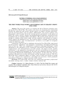 Метою статті є аналіз життя прифронтових міст України у часи Першої світової війни. Автори зосереджуються також на вивченні взаємовідносин влади і суспільства, окремих сюжетів жіночих досвідів війни та посиленні суспільної ролі жінки. Додатково аналізуються нові явища повсякденного життя воєнного періоду, зокрема у сфері громадського життя, культури, політики, санітарно-епідеміологічного стану та надання медичної допомоги пораненим солдатам та офіцерам. Новизна роботи полягає у спробі поєднати історію міста в умовах війни та елементів жіночої історії на тлі війни. Дослідження відображає загальну тенденцію до “антропологізації” та “оповсякденювання” історії, як прагнення зробити жінку історичним дієвцем. Висновки. Місто та його мешканці в умовах Першої світової проходили періоди “адаптації” початкового періоду та “звикання” протягом наступних років війни. Вони змушені були реагувати на виклики, що проявлялось у появі нових інституцій та явищ (благодійні, громадські організації, активізація профспілок; постать “публічного інтелектуала”), адаптації виробництва та перепрофілювання діяльності закладів (обладнання для фронту та боротьби із інфекційними хворобами; перетворення навчальних закладів на шпиталі). Але при цьому, зберігались довоєнні практики, властиві для життя міста поза війною. Перша світова мала помітний вплив на жінок, частина з яких змушена була “примірювати” на себе нові ролі, здобувати новий досвід та засвоювати нові практики, що поступово призводило до зміни становища жінок у суспільстві.