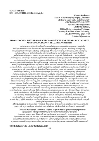 Artykuł poświęcony jest filozoficzno-religioznawczej analizie monastycyzmu jako holistycznemu uczeniu duchowemu, łączącemu praktyki ascetyczne, modlitwę wewnętrzną, mistyczną kontemplację i refleksję teologiczną. Monastycyzm jest postrzegany jako szczególny rodzaj duchowego doświadczenia, którego celem jest radykalna transformacja ludzkiej podmiotowości poprzez proces oczyszczenia serca, skupienia świadomości i intensyfikacji postrzegania sakralnej obecności.Ujawniono istotę monastycznej ascezy jako praktyki duchowej, zorientowanej na przemianę świadomości i osiągnięcie harmonii między wewnętrznym i zewnętrznym wymiarem bytu. Szczególną uwagę zwraca się na zjawisko modlitwy wewnętrznej jako metody uzyskania głębokiej ciszy umysłu, która stwarza warunki do kształtowania mistycznego horyzontu bytu. Ustalono duchowo-praktyczne formy realizacji ideału monastycznego. Ustalono, że monastycyzm nie sprowadza się do indywidualnego mistycyzmu, ale stanowi szczególny model wspólnoty duchowej, w której ascetyczny styl życia łączy się z służbą etyczną, praktykami kulturotwórczymi, myśleniem teologicznym i tradycją liturgiczną. W wymiarze filozoficznym monastycyzm jest interpretowany jako projekt transformacji ludzkiej egzystencji, mający na celu przezwyciężenie fragmentacji i wyobcowania charakterystycznego dla zwykłego doświadczenia. Stan wewnętrznej ciszy jawi się jako ontologiczny warunek osiągnięcie jedności i otwartości na absolutyzowane źródło bytu. Duchowość monastyczna jest opisywana jako przejście od zewnętrznej różnorodności do wewnętrznej prostoty, od dyskursywności do holistycznej wizji, od egocentrycznego doświadczenia do odnowionej struktury podmiotowości, która jest zdolna do współistnienia z transcendencją. Udowodniono, że monastycyzm jest nie tylko odrębnym kierunkiem praktyki duchowej, ale fundamentalną doktryną filozoficzno-antropologiczną, oferującą uniwersalny model duchowego wzrostu, w którym wewnętrzna modlitwa, kontemplacja, powściągliwość moralna i wolność duchowa tworzą holistyczną ścieżkę samostworzenia. To uczenie łączy głębię ontologiczną i praktykę etyczną, co czyni jego jedną z najbardziej pojęciowych tradycji mistyki chrześcijańskiej.