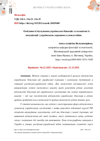 | ДСТУ 8302:2015: | Амма А. В. Особливості відчуження українських біженців та механізми їх комунікації з українською державою в умовах війни. Вісник гуманітарних наук. 2025. № 14. С. 1–16. DOI: 10.5281/zenodo.18029688. |
