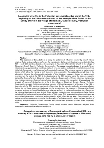 Сезонність народжень у Волинській губернії наприкінці ХІХ – на початку ХХ ст. (на прикладі приходу Дмитрівської церкви с. Білошиці Овруцького повіту Волинської губернії).