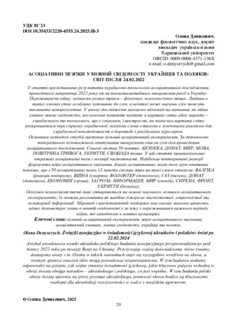 | ДСТУ 8302:2015: | Денисевич О. В. Асоціативні зв’язки у мовній свідомості українців та поляків: світ після 24.02.2022. Українська полоністика. 2025. Т. 24, № 2. С. 20–30. DOI: 10.35433/2220-4555.24.2025.fil-3. |
