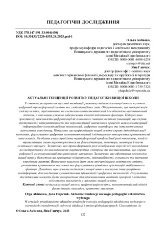 У статті розкрито актуальні тенденції розвитку педагогіки вищої школи в умовах цифрової трансформації освіти та глобалізаційних змін. Обґрунтовано, що модернізація змісту освіти, зорієнтована на системно-компетентнісний і особистісно орієнтований підходи, є ключовою умовою забезпечення якості підготовки фахівців. Підкреслено зростаючу важливість цифровізації як ключового чинника освітніх інновацій, що сприяє доступності, інтерактивності та персоналізації навчальних процесів шляхом інтеграції інформаційно-комунікаційних технологій, цифрових платформ та інтелектуальних навчальних середовищ. Показано, що цифровізація вищої освіти сприяє індивідуалізації навчання, формуванню цифрових компетентностей і підвищенню конкурентоспроможності випускників. Особлива увага приділена трансформації професійної ролі викладача, який із транслятора знань перетворюється на фасилітатора, тьютора, ментора й коуча освітнього процесу. Зазначено, що трансформація ролі відображає перехід від викладання як інструктажу до викладання як партнерства, співпраці та наставництва, що сприяє рефлексії, самоорганізації та ціннісному навчанню. Зазначено, що ефективна педагогіка вищої школи базується на принципах відкритості, інноваційності, гуманізму та навчання впродовж життя. Визначено взаємозв’язок між модернізацією освітнього змісту, розвитком критичного мислення та формуванням ціннісних орієнтацій майбутнього фахівця. Доведено, що сучасна педагогіка вищої школи виступає інтеграційною платформою для поєднання гуманістичних цінностей і цифрових технологій. Результати дослідження можуть бути використані для вдосконалення освітніх програм і методик підготовки викладачів у закладах вищої освіти.