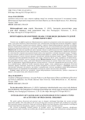 | ДСТУ 8302:2015: | Максимова О. О. Інтеграція валеологічних знань у різні види діяльності дітей дошкільного віку. Acta Paedagogiсa Volynienses. 2025. № 5. С. 19–25. DOI: 10.32782/apv/2025.5.3. |
