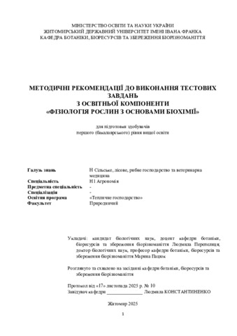 Методичні рекомендації до виконання тестових завдань з освітньої компоненти «Фізіологія рослин з основами біохімії».