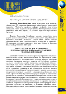 У статті актуалізовано проблему збереження та відновлення психічного здоров’я військовослужбовців, що перебували в умовах збройних конфліктів. На основі аналізу сучасних наукових досліджень проблеми відновлення психічного здоров’я осіб із бойовим досвідом, окреслено основні психоемоційні порушення, характерні для військовослужбовців після участі у бойових діях. Доведено необхідність пошуку ефективних, безпечних і доступних підходів до їх психічної реабілітації, що могли повноцінно доповнювати або підсилювати традиційні медико-психологічні заходи. Для розв’язання поставленого завдання запропоновано використання потенціалу рекреалогії – міждисциплінарної наукової галузі знань, у фокусі якої перебуває вивчення ресурсів людини та механізмів їх регенерації за допомогою цілеспрямованого використання організованих форм активного відпочинку, рухової діяльності, емоційного розвантаження й соціальної взаємодії. Наголошено, що в умовах посттравматичного стресу, емоційного виснаження, підвищеної тривожності та порушень сну фізична активність рекреаційного спрямування виступає дієвим ресурсом психоемоційної стабілізації та повернення до активного цивільного життя. Ефективним інструментом психоемоційної розрядки, зменшення тривожності, поліпшення сну та загального самопочуття осіб з бойовим досвідом визначено фізичну рекреацію – ресурсоорієнтований засіб відновлення фізичного здоров’я; цілеспрямовану рухову діяльність оздоровчого й відновлювального характеру фізичного здоров’я людини. На основі аналізу нейробіологічних, психофізіологічних, психологічних і соціальних механізмів взаємозв’язку фізичного та психічного здоров’я закцентовано увагу на ефективності засобів фізичної рекреації для відновлення психічного здоров’я. Систематизовано форми фізичної рекреації, спрямовані на відновлення й підтримання психічного здоров’я особистості, серед яких: оздоровчо-рухова активність, циклічні види рухової активності, окреслено специфіку їх застосування у оздоровчо-рекреаційних практиках. Запропоновано використання скандинавської ходи як ефективного шляху відновлення психічного здоров’я військовослужбовців – учасників бойових дій, з урахуванням її адаптивного характеру: можливість регулювання рівня навантаження; відсутність потреби у складній інфраструктурі; проведення занять на відкритому просторі та ін. Спрогнозовано необхідність розробки, обґрунтування, впровадження комплексних моделей підтримки психічного здоров’я осіб із бойовим досвідом, здійснення емпіричної перевірки ефективності конкретних рекреаційних програм, визначення оптимальних форм і умов їх застосування у практичній діяльності психологів, фахівців із фізичної реабілітації, працівників реабілітаційних центрів і закладів фізичної культури та спорту.