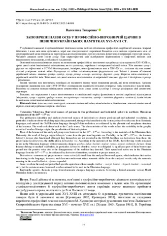Титаренко В. М.ORCID: https://orcid.org/0000-0003-4425-4670 (2025) Запозичені назви осіб у професійно-виробничій царині в північноукраїнських пам’ятках XVI–XVII ст. Філологічний часопис. № 26. С. 77–83. ISSN 2415-8828. DOI: 10.31499/2415-8828.2.2025.346988.