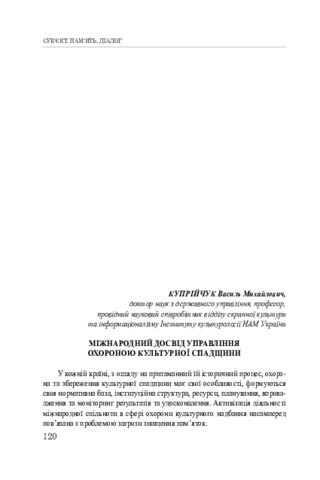 Купрійчук В. М.ORCID: https://orcid.org/0000-0001-7229-1749 (2022) Міжнародний досвід управління охороною культурної спадщини. In: Дистанційний науковий круглий стіл «Охорона культурної спадщини в умовах глобальних загроз сучасності: теоретичні та практичні аспекти», 20 червня 2022 р., Київ. С. 120–123.