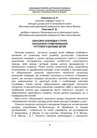 Сіваченко О. П., Плетяна Є. В. (2026) Сенсорні осередки у групі: технологія стимулювання чуттєвого досвіду дітей. In: Міжнародна науково-практична конференція «Science, Educational, and Society: an interdisciplinary approach to addressing global challenges», 9 січня 2026 р., Лос-Анджелес, США. С. 9–13.