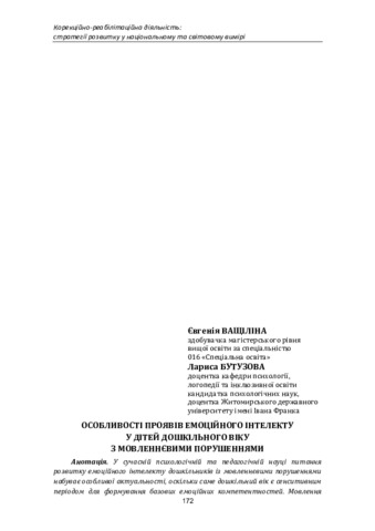 Особливості проявів емоційного інтелекту у дітей дошкільного віку з мовленнєвими порушеннями.