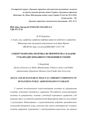 Купрійчук В. М.ORCID: https://orcid.org/0000-0001-7229-1749 (2025) Соціогуманітарна політика як пріоритетна складова гуманізації державного управління в Україні. Державне управління: удосконалення та розвиток. № 11. С. 1–16. ISSN 2307-2156. DOI: 10.32702/2307-2156.2025.11.2.