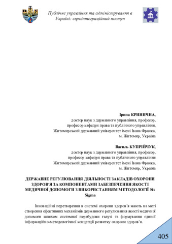 Кринична І. П.ORCID: https://orcid.org/0000-0002-2823-3397, Купрійчук В. М.ORCID: https://orcid.org/0000-0001-7229-1749 (2025) Державне регулювання діяльності закладів охорони здоров’я за компонентами забезпечення якості медичної допомоги з використанням методології Six Sigma. In: Всеукраїнська науково-практична конференція за міжнародною участю «Публічне управління та адміністрування в Україні: євроінтеграційний поступ», 30 травня 2025 р., Івано-Франківськ. С. 405–409.